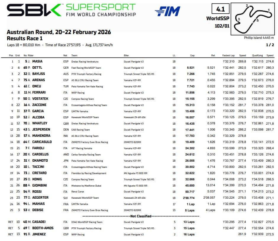 Nella classe Supersport è Jaume Masià a fare il Bulega, concretizzando la partenza dalla pole position e vincendo Gara 1 con margine su Philipp Oettl. Primo podio in carriera, per giunta sul tracciato di casa, per un ottimo Oli Bayliss: l’australiano ha tenuto a bada le Yamaha di Albert Arenas e Can Oncu, che ha chiuso la top five. Sesta posizione per il migliore degli italiani, Matteo Ferrari, davanti a Ondrej Vostatek e Alessandro Zaccone. Punti per Federico Caricasulo e Filippo Farioli, quattordicesimo e quindicesimo.