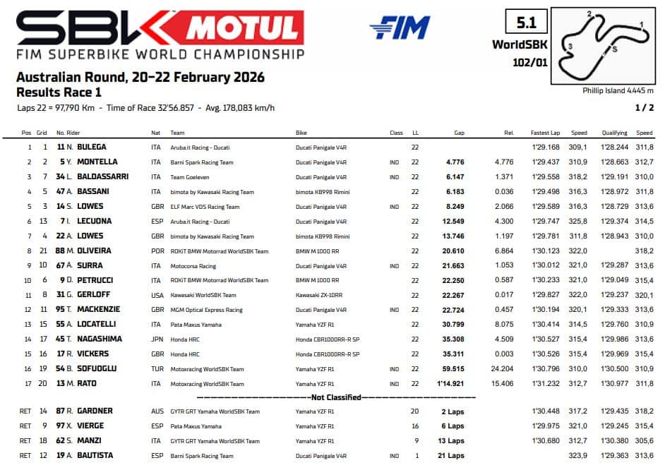 phillip islandGrande italia in Sbk: Nicolò Bulega vince gara 1 a Phillip Island, la prima del 2026, in un podio tutto italiano. Alle spalle del ducatista di Aruba Racing ci sono infatti le altre Ducati di Yari Montella (team Barni) e Lorenzo Baldassarri (GoEleven). A completare il sabato magico in Australia per i nostri colori il 4° posto di Bassani (Bimota). Più indietro le Bmw, con Oliveira 8° e Petrucci 10°. Ti sei perso gara 1? Su Sky Sport MotoGP la puoi rivedere in replica alle 9.30, alle 13.15, alle 17.15 e alle 21.15