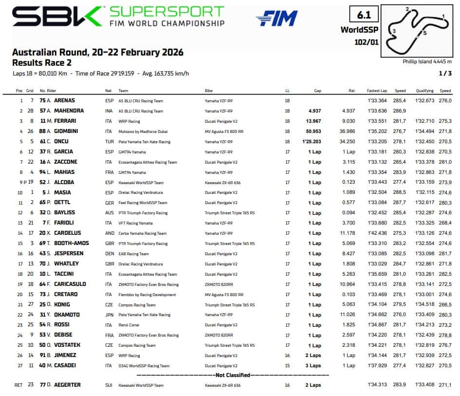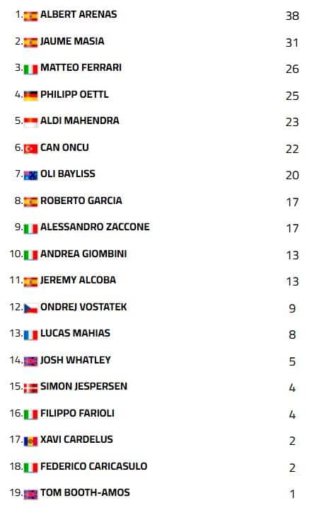 In Supersport capolavoro strategico per il team AS Racing, che nonostante la pioggia sceglie le gomme slick per entrambi i piloti e fa doppietta in Gara 2: Albert Arenas vince la sua prima gara nel weekend di debutto, mentre il suo compagno Aldi Satya Mahendra porta l’Indonesia per la prima volta sul podio della categoria. Stessa scelta di gomme per Matteo Ferrari e Andrea Giombini, terzo e quarto in una domenica molto positiva per i colori italiani. Quinto posto per Can Oncu, primo tra i piloti scattati con la gomma da bagnato e costretti al pit stop dopo i primi giri. Alle sue spalle Roberto Garcia e Alessandro Zaccone, settimo; tra gli italiani va a punti anche Filippo Farioli, che chiude tredicesimo. Il vincitore di Gara 1 Jaume Masià è decimo, vittima del caos del cambio gomme così come Philipp Oettl e Oli Bayliss (giunti dietro di lui, nello stesso ordine del podio di ieri).