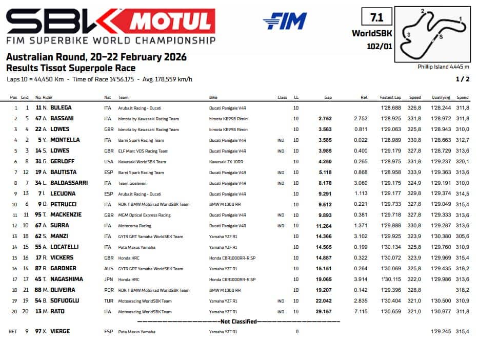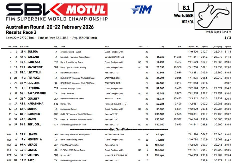 Nicolò Bulega si conferma il re di Phillip Island conquistando sia Superpole Race che Gara 2 in una domenica australiana condizionata dalla pioggia. Confermandosi imprendibile tanto sull’asciutto quanto sul bagnato, il pilota di Aruba Racing - Ducati colma anche l’ultima lacuna nel suo curriculum e appare sempre più imbattibile. Bulega è ora leader del campionato a punteggio pieno. Axel Bassani ci ha provato nei primi giri della Superpole Race, salvo poi veder scappare Bulega nella lotta per la vittoria. Il secondo posto di Bassani però è significativo, nonché storico per Bimota, che mette Alex Lowes in terza posizione e completa una doppia presenza sul podio che mancava dal 1988. Quarto Yari Montella, a punti anche Lorenzo Baldassarri col nono posto.