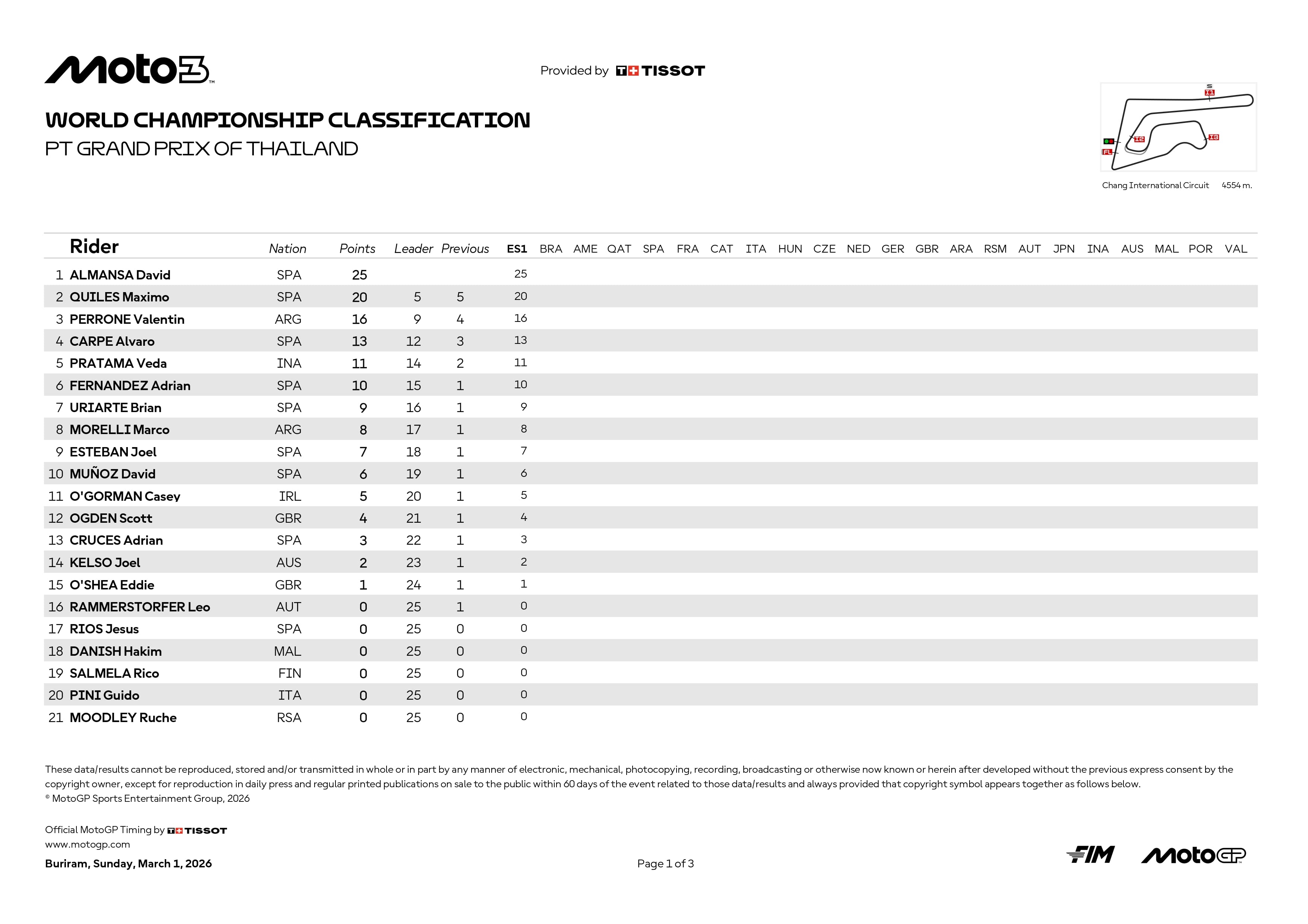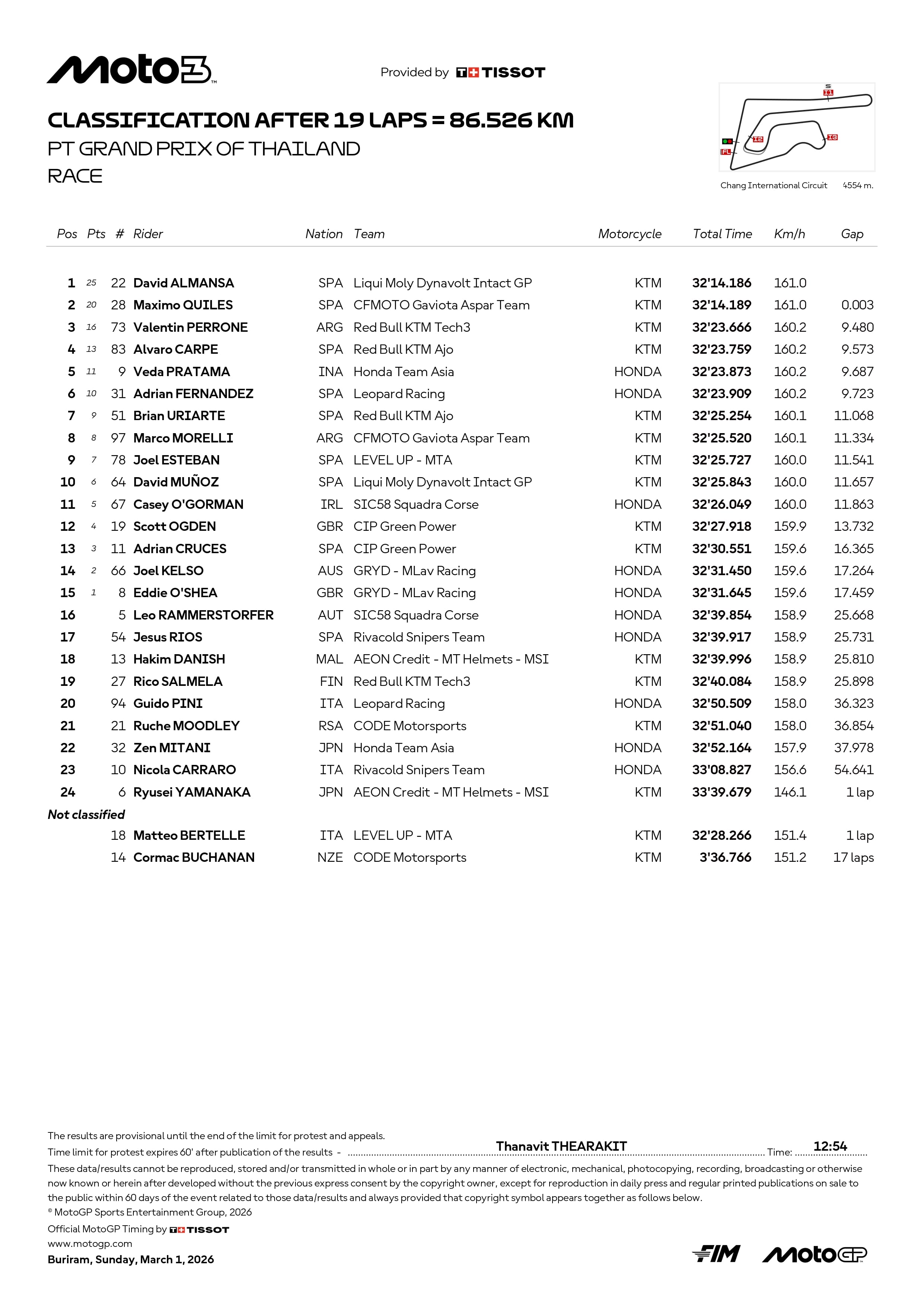 Alle sue spalle Perrone e Carpe (altri due giovani da seguire con attenzione) si sono ritrovati a sgomitare con il bravo Fernandez e il sorprendente Pratama, rookie di casa, sostenuto da Honda Asia. La lotta per l’ultimo gradino disponibile sul podio ha infine premiato l’argentino di Tech 3 (per la soddisfazione di Gunther Steiner, da poco subentrato nella proprietà del team). Fuori dai giochi, fin dalle prove, Munoz s’è dovuto accontentare del decimo posto. Italiani non pervenuti: la speranza risposta su Pini (nono tempo in qualifica) è sfumata al terzo giro, a causa di una scivolata, sorte analoga toccata a Bertelle (decisamente non ancora in forma) a due giri dalla fine. Entrambi hanno ripreso la corsa, finendo però in fondo al gruppo con distacchi superiori a mezzo minuto: 20° Pini, 24° Bertelle alle spalle del connazionale Carraro.