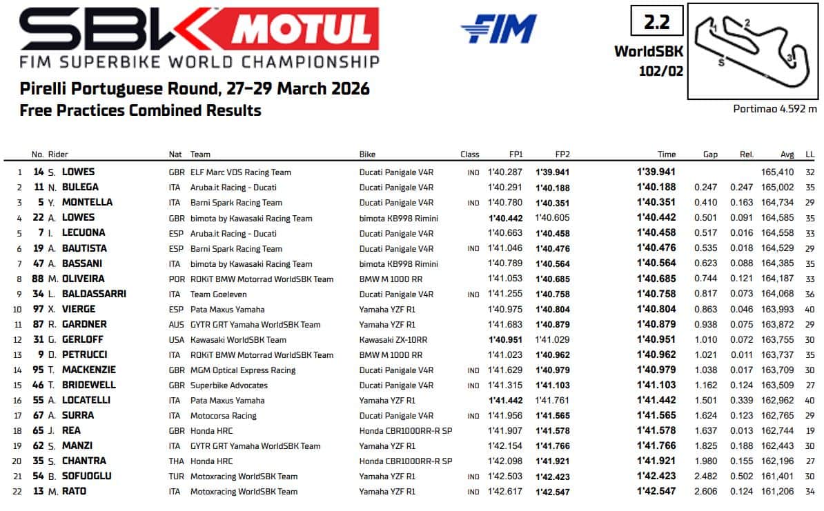 Il secondo round del mondiale Superbike prende il via con le prove libere del venerdì, che confermano in larga parte i valori in campo visti a Phillip Island. Sul tracciato di Portimao è stato Sam Lowes a dettare il passo, comandando entrambe le sessioni di giornata nonostante un polso ancora malandato (a causa dell’infortunio nella prima tappa). Nel pomeriggio l’inglese ha fermato il cronometro in 1’39.941, unico pilota a scendere sotto il muro del 1’40. Il più convincente sul passo gara, però, è stato Nicolò Bulega: il leader del mondiale ha siglato il proprio miglior giro in 1’40.188, ma ribattendo più volte tempi simili (nel giro di pochi decimi). Ancora Ducati in terza posizione, con Yari Montella molto veloce davanti ad Alex Lowes sulla prima delle Bimota. Una noia tecnica al mattino e una scivolata in FP2 non hanno impedito a Iker Lecuona di chiudere quinto nella combinata delle due sessioni, con Alvaro Bautista alle sue spalle e Axel Bassani al settimo posto. Segnali di progresso arrivano da BMW, con Miguel Oliveira ottavo in una top ten completata da Lorenzo Baldassarri e Xavi Vierge. Tredicesimo tempo per Danilo Petrucci, sedicesimo per Andrea Locatelli appena davanti ad Alberto Surra, mentre Stefano Manzi e Mattia Rato hanno terminato al diciannovesimo e ventiduesimo posto. Da segnalare il ritorno in pista di Jonathan Rea (diciassettesimo), caduto senza conseguenze nel pomeriggio in sella alla Honda, sulla quale sostituisce Jake Dixon.