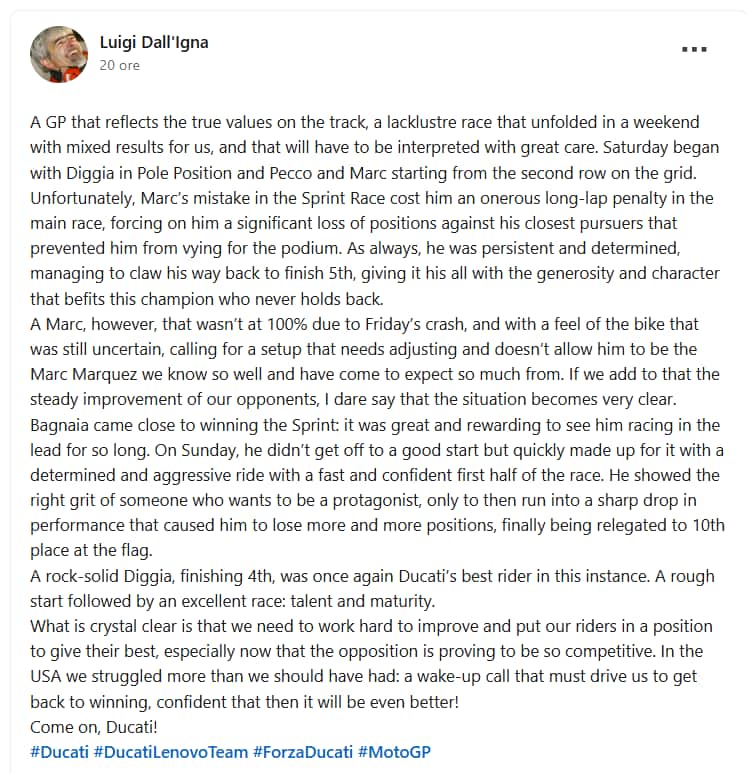 "Un weekend con risultati contrastanti per noi e che dovrà essere interpretata con grande attenzione". Inizia così il post su Linkedin di Luigi Dall'Igna, direttore generale di Ducati Corse, al termine dell'ultimo fine settimana di MotoGP ad Austin. Il team di Borgo Panigale, dopo aver conquistato la pole con Di Giannantonio e chiuso al 2° posto la Sprint Race con Bagnaia, ha faticato nella gara lunga, nella quale non è riuscita a centrare il podio con nessuna delle sue sei moto. La miglior Ducati è stata quella di Fabio Di Giannantonio (4°), seguito da Marc Marquez (5°). Gli altri piloti sono rimasti fuori dalla top 5: Alex Marquez 7°, Bagnaia 10°, Aldeguer 11° e Morbidelli 14°.