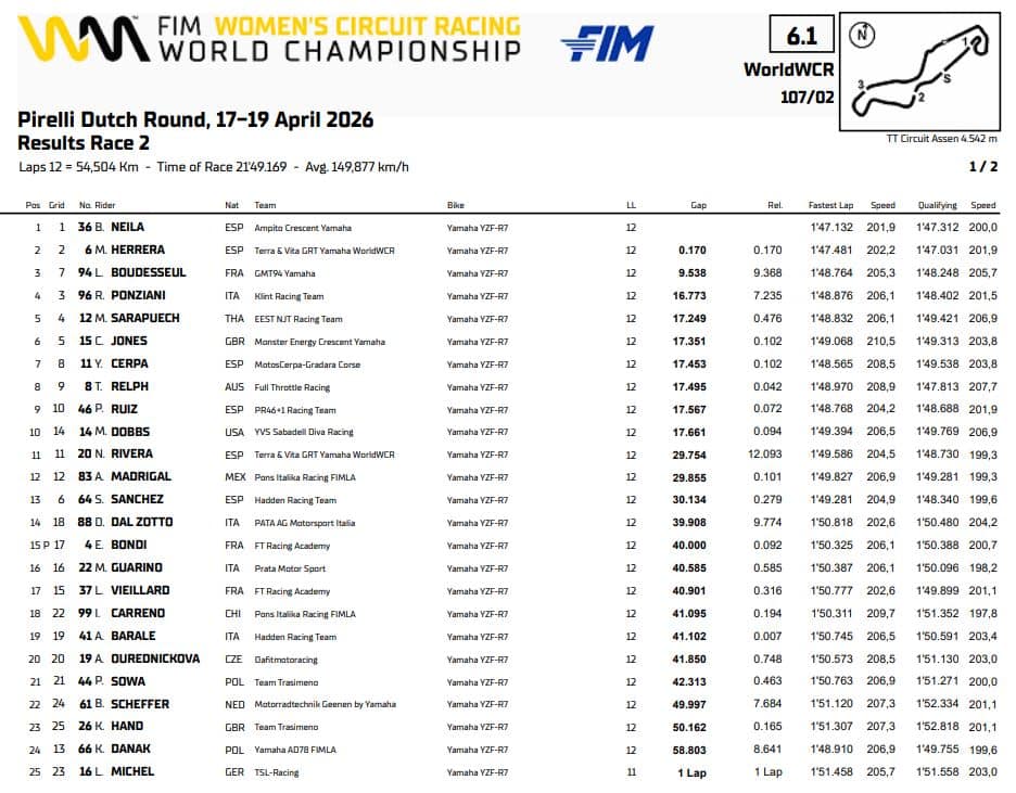Capolavoro di Beatriz Neila in Gara 2 del WorldWcr, che come nella Gara 2 dello scorso anno batte Maria Herrera per una manciata di centesimi. La spagnola del team Ampito Crescent Yamaha ha superato la connazionale all’ultima staccata nonostante la sua strenua resistenza, ottenendo il primo successo in stagione e il quinto in totale nella categoria. Staccata, ma sul podio Lucie Boudesseul. Quarta Roberta Ponziani, a punti Denise Dal Zotto col quattordicesimo posto.