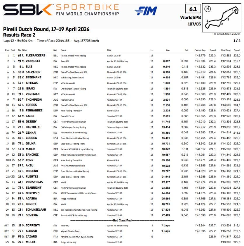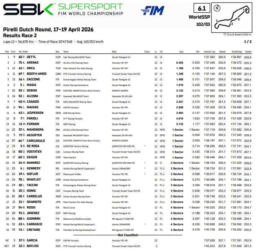 assenUna bandiera rossa ferma con anticipo Gara 2 di Supersport, consegnando la prima vittoria in carriera a Oettl su Ducati. Arenas (2°) è sul podio con Oncu e accorcia in classifica su Masià (6°). Fleerackers batte Vannucci nella Sportbike, Neila sorprende Herrera nel WorldWcr