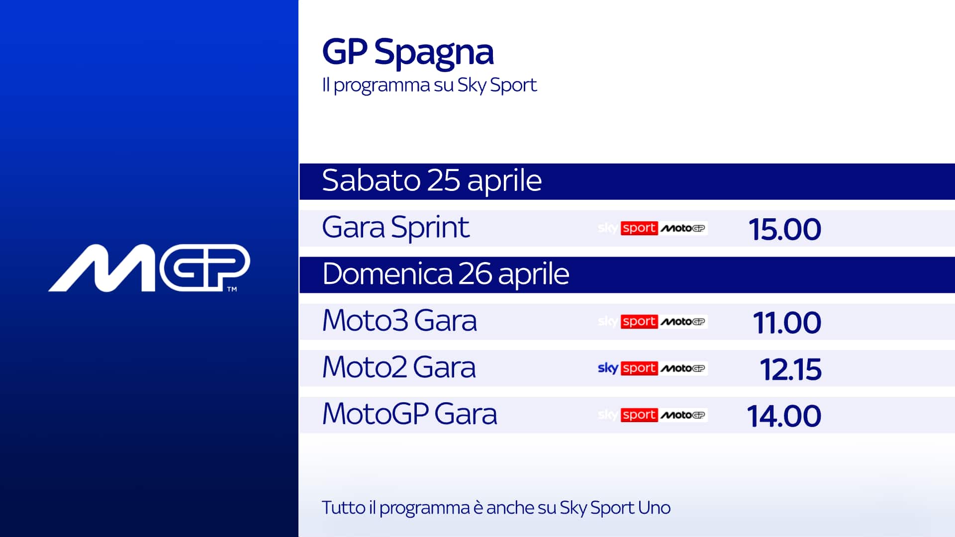 Il Motomondiale sbarca a Jerez per il primo appuntamento europeo della stagione. Il Gran Premio di Spagna è LIVE su Sky Sport e in streaming su NOW fino a domenica 26 aprile con il racconto di Guido Meda e Mauro Sanchini. Vera Spadini conduce gli approfondimenti di pre e post gara, con gli aggiornamenti dalla pista affidati a Sandro Donato Grosso e Giovanni Zamagni. A Rosario Triolo e Mattia Pasini il commento di Moto2 e Moto3.