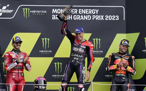 - Nel 2023 il capolavoro dello stesso Aleix Espargaró: il catalano vince il GP Gran Bretagna (2° successo in top class) superando Bagnaia all’ultimo giro, al termine di una gara condizionata nel finale da qualche goccia di pioggia. Sul podio anche Brad Binder. Poi Oliveira, Vinales e Martin, che scivola a -41 in classifica da Pecco.