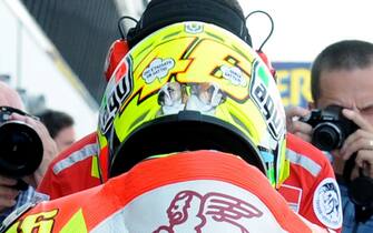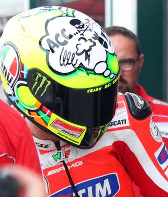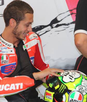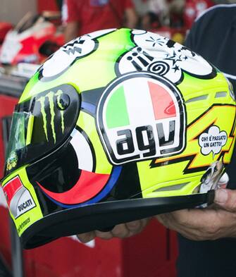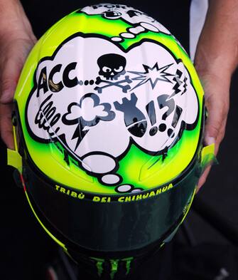 Valentino Rossi sta vivendo una stagione mediocre e così, a Misano, si è presentato con un casco autoironico sul quale compare una nuvoletta da fumetto con, all'interno, tutti i suoi brutti pensieri sulla stagione. LE FOTO