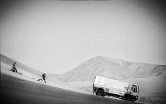 Per la serie contrattempi dalla Dakar. Hans Stacey insegue il suo camion Iveco tra le dune di Iquique, in Cile -