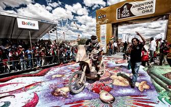 Bolivia in festa per il primo storico passaggio della Dakar. Nella foto le celebrazioni al traguardo di Uyuni per lo spagnolo Marc Coma -