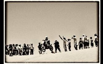 Cominciano le dune nel secondo giorno, con il trasferimento a Mendoza. In questa foto incorniciata, un salto di Philippe Prunier fra l'incitamento dei tifosi -