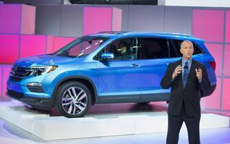 Honda ha scelto il colore blu per presentare al mondo il Pilot, qui introdotto dal responsabile della casa giapponese Marc Ernst -