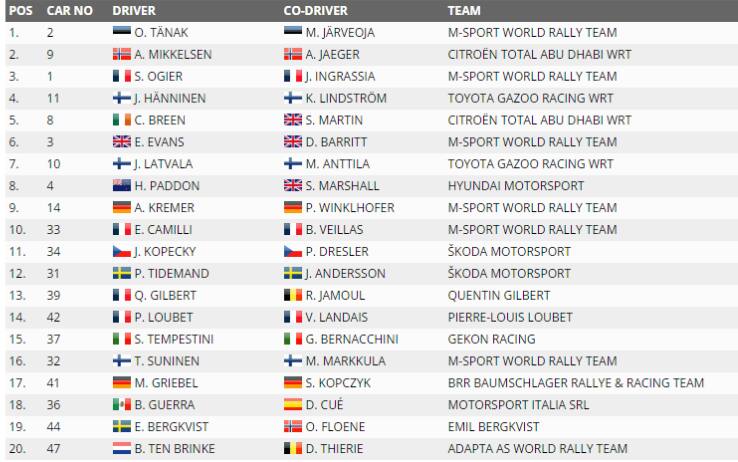 La classifica costruttori vede la M-Sport allungare. Il team inglese, che mette in strada le Ford Fiesta di Ogier e Tanak, ha ora 325 punti, con Hyundai ora attardata a 261. Toyota è terza a 213 e Citroen chiude con 163