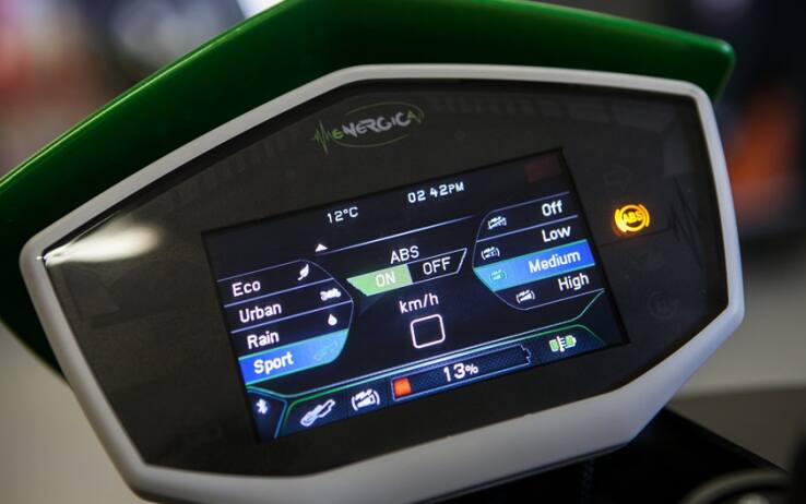 Bello il cruscotto TFT a colori con GPS integrato e sistema Bluetooth per interfacciarsi con gli smartphone attraverso l’app MyEnergica, che permette di gestire diversi aspetti dell’elettronica ed offre diverse funzionalità di contorno come la localizzazione (e la prenotazione) delle colonnine di ricarica, soprattutto le FastCharge – al momento tecnologia esclusiva Energica per le due ruote – che permettono di ricaricare le batterie fino all’80% in 30 minuti.