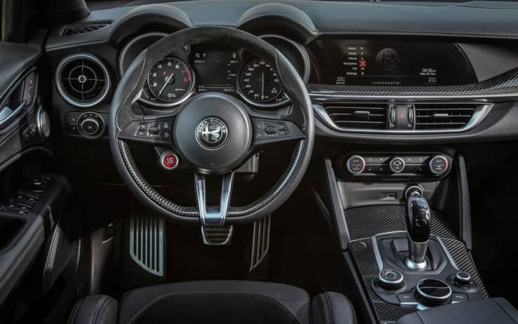 470 cm di lunghezza, con 282 cm di passo e 6 cm in più per larghezza rispetto ai modelli Stelvio “normali” sfiorando quasi i due metri. In bella vista grandi cerchi 20" a gommatura Pirelli PZero, con dischi freno 390 e 350 mm. è però sotto il cofano che si trova l’elemento cardine, un motore benzina V6 da 2.891cc che ha “qualcosina in comune” con certi motori in uso a Ferrari, tanto per darne una sintetica nota: 510 CV a 6.500 giri, 600 Nm tra i 2.500 e i 5.000. Resa altissima, senza scordare però consumi ed emissioni, grazie alla disattivazione delle bancate (non dei cilindri, ndr). Il risultato è un consumo medio dichiarato di 11,1 km/litro. Internamente ci sono pelle e alcantara, con varie finiture sportive di carbonio e alluminio, apprezzate ed eventualmente abbinabili a elementi Sparco, opzionali, molto corsaioli. Soprattutto su Stelvio 2018 troviamo anche gradite evoluzioni nell’Infotainment, rispetto alla Giulia, includendo CarPlay e AndroidAuto. Vero è che per questi aspetti di contenuto fruibile in abitacolo, qualcosa alle rivali premium si paga ancora. È la contropartita servita ai puristi della guida.
