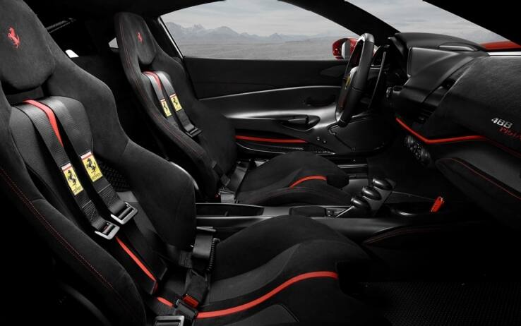 Rispetto alla propria progenitrice, la 488 Pista è stata alleggerita di circa 90 kg, grazie all’utilizzo massiccio della fibra di carbonio, impiegata per cofano, paraurti, spoiler posteriore e i cerchi da 20", opzionali, arrivando a pesare 1.280 kg.