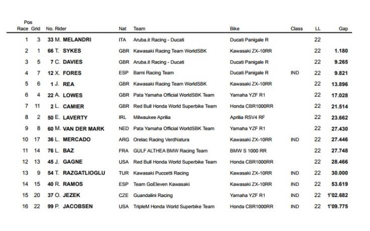 Dietro a Ducati e Kawasaki spunta la Yamaha che si deve far bastare il sesto posto di Lowes, staccato. Settimo al traguardo Camier che porta la Honda molto avanti considerando i risultati del 2017. Avrebbe potuto probabilmente far meglio senza la botta nella Superpole, durante la quale anche Savadori ha rimediato una frattura alla clavicola che gli ha impedito di prendere il via. Il compagno di squadra in Aprilia, Laverty, ha chiuso ottavo.