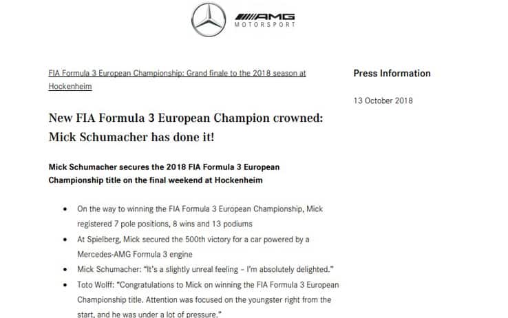 MotoriPer come è cominciata la stagione, nessuno l’avrebbe mai detto. E invece alla fine, all’ultimo appuntamento ad Hockenheim, è stato Mick Schumacher ha passare sotto la bandiera a scacchi da campione Euro Formula 3 2018: in Gara-2, a Hockenheim, è bastato il secondo posto. Per Schumi Jr. anche i complimenti della Mercedes