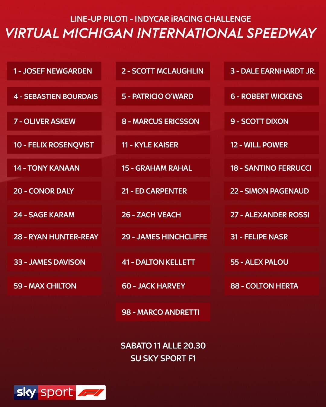 - Saranno cinque i nuovi piloti che prenderanno parte all’Indycar iRacing Challenge in occasione della Chevrolet 275: Marco Andretti (Andretti Herta with Marco Andretti & Curb-Agajanian), Max Chilton (Carlin), James Davison (INDYCAR Provisional), Dale Earnhardt Jr. (INDYCAR Provisional) Ryan Hunter-Reay (Andretti Autosport).