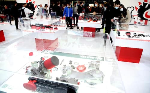 Non solo moto italiane a Eicma, ma anche componentistica: qui in primo piano un motore della Malossi, azienda italiana con sede a Calderara di Reno (in provincia di Bologna), specializzata nel campo dei motori e soprattutto nel settore della componentistica per moto e ciclomotori