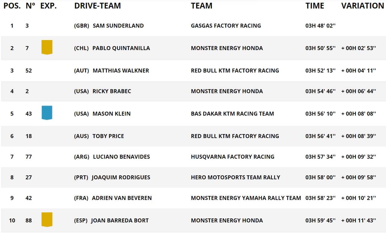 MotoriSam Sunderland vince l'ottava tappa della Dakar tra le moto, una speciale di 395 km in Arabia Saudita. Il britannico della KTM precede il cileno Pablo Quintanilla (2°) e l'austriaco Mattias Walkner (3°). Danilo Petrucci chiude al 25° posto