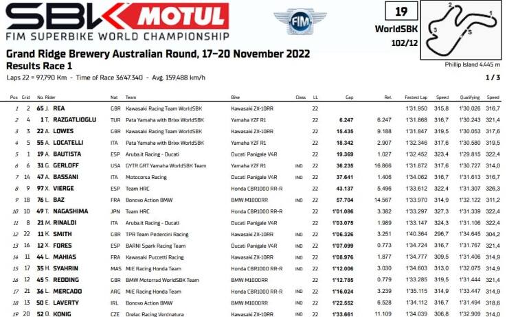 L’ultimo atto del mondiale Superbike 2022 si apre con un inatteso "coup de théâtre": Gara 1 di Phillip Island parte con la pista bagnata, ma lo stop della pioggia e la comparsa del sole asciugano rapidamente l’asfalto. Ne deriva una gara in due parti, iniziata con tutti i piloti su gomma rain e intervallata da un pit stop intorno alla sua metà per montare (quasi tutti) le slick. A gestire al meglio la situazione è Jonathan Rea, che dopo aver comandato nei primi giri insieme al compagno di squadra Alex Lowes sceglie il momento giusto per il rientro. Insieme al nordirlandese si ferma anche Toprak Razgatlioglu, mentre Alvaro Bautista aspetta un giro e Lowes addirittura due. Con la girandola dei cambi gomme Rea acquisisce margine, involandosi in solitaria verso quel successo che mancava da ventiquattro gare, da Gara 2 di Estoril. Razgatlioglu è secondo davanti a Lowes, mentre nella fase asciutta Bautista deve cedere anche ad Andrea Locatelli per la quarta posizione, chiudendo quinto dopo la partenza dalla pole position; il suo risultato è comunque sufficiente ad assicurare a Ducati il titolo costruttori che (come quello piloti) mancava dal 2011. Garrett Gerloff è sesto assoluto e primo degli indipendenti precedendo Axel Bassani, in top-10 anche Xavi Vierge, Loris Baz e Tetsuta Nagashima.