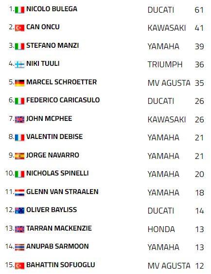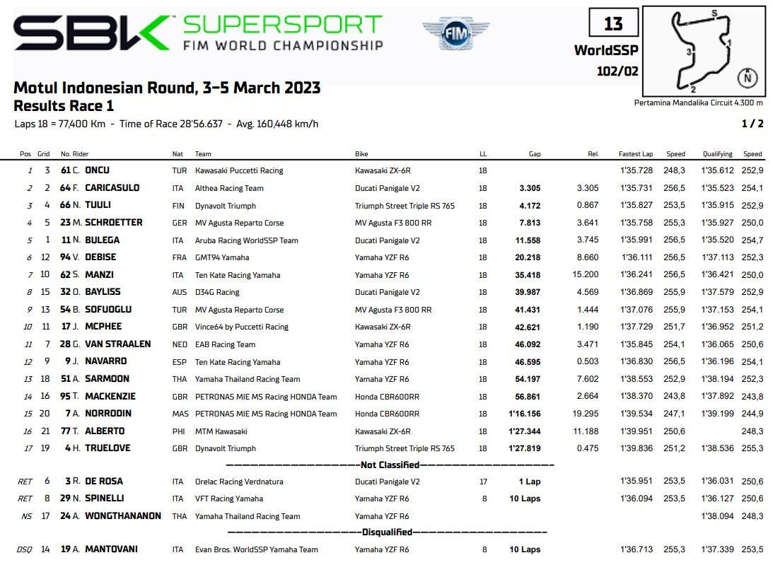 Can Oncu vince la sua prima corsa in Supersport in Gara 1 a Mandalika. È una vittoria attesissima, giunta dopo quattro anni di tentativi e condivisa con il team Kawasaki Puccetti Racing. Dopo una partenza rapidissima, il pilota turco ha preso la testa nei primi chilometri, poi con qualche goccia di pioggia in pista ha costruito un piccolo margine sugli inseguitori, sfruttando la sua grande sensibilità. Oncu ha chiuso in solitaria sotto la bandiera a scacchi, regalandosi quel successo che mancava al suo percorso di crescita. Dietro di lui c’è stata una battaglia entusiasmante tra Federico Caricasulo e Niki Tuuli, che ha premiato l’italiano. Per lui è il ventottesimo podio in Supersport, numeri da vero veterano della categoria. Il grande marasma degli ultimi giri ha invece spaccato il poker di piloti in lotta per la quarta posizione: il veloce Marcel Schrotter ha concluso ai piedi del podio, mentre Nicolò Bulega è giunto quinto dopo aver colpito Glenn Van Straalen causandone la caduta. Grande sfortuna per Raffaele De Rosa, quarto fino a pochi giri dal termine e poi ritirato a causa di una foratura alla gomma posteriore. Valentin Debise ne ha approfittato per salire in sesta posizione, mentre per Stefano Manzi si è trattata di una gara di sofferenza: partito decimo, il pilota di Yamaha Ten Kate ha accusato problemi con lo pneumatico anteriore e non è andato oltre il settimo posto. Top-10 per Oliver Bayliss, Bahattin Sofuoglu e John McPhee. Caduti Nicholas Spinelli e Andrea Mantovani.