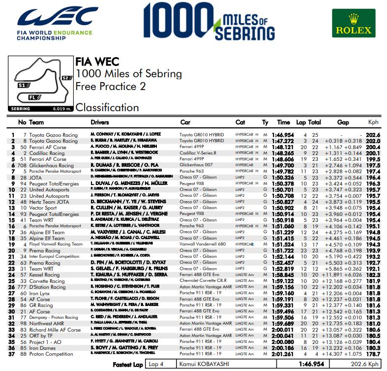 Il secondo turno di prove libere della 1000 Miglia di Sebring, primo atto del FIA World Endurance Championship, si è chiuso con la doppietta di Toyota Gazoo Racing, al primo posto con la GRO010 #7 di Kamui Kobayashi, José Maria Lopez e Mike Conway. L’equipaggio iridato nella Super Season 2019-2020 e nel 2021 ha abbattuto la barriera dell’1:47 fermando il cronometro sul tempo di 1:46.954, tempo registrato da Kobayashi nella prima metà della sessione. A tre decimi dal riferimento appena citato si è piazzato Brendon Hartley, pilota della Toyota #8 guidata in compagnia di Sébastien Buemi e Ryo Hirakawa, il più veloce delle FP1. Entrambe le vetture del Gazoo Racing Team hanno ricoperto un buon numero di km: con i 25 giri della #7 ed i 24 della #8, Toyota si è imposta anche nella distanza percorsa.