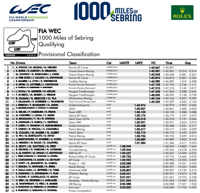 Toyota, ben consapevole del potenziale in ottica gara, non è riuscita a controbattere, accontentandosi di un secondo e terzo posto rispettivamente occupati dalle GR010 numero 8 (Hartley-Buemi-Hirakawa) e 7 (Kobayashi, Conway, Lopez). Allo sventolare della bandiera verde le due hypercars giapponesi saranno seguite dalla seconda Ferrari 499P, la #51 di Alessandro Pier Guidi (il pilota designato per la qualifica), James Calado e Antonio Giovinazzi. A due decimi da prototipo di AF Corse è spuntata la Cadillac di Alex Lynn, uscita dai box dopo aver trascorso quasi metà sessione in pit lane. Nonostante il poco tempo a disposizione Lynn ha preso ritmo rapidamente, ottenendo il quinto tempo alla fine della sessione.