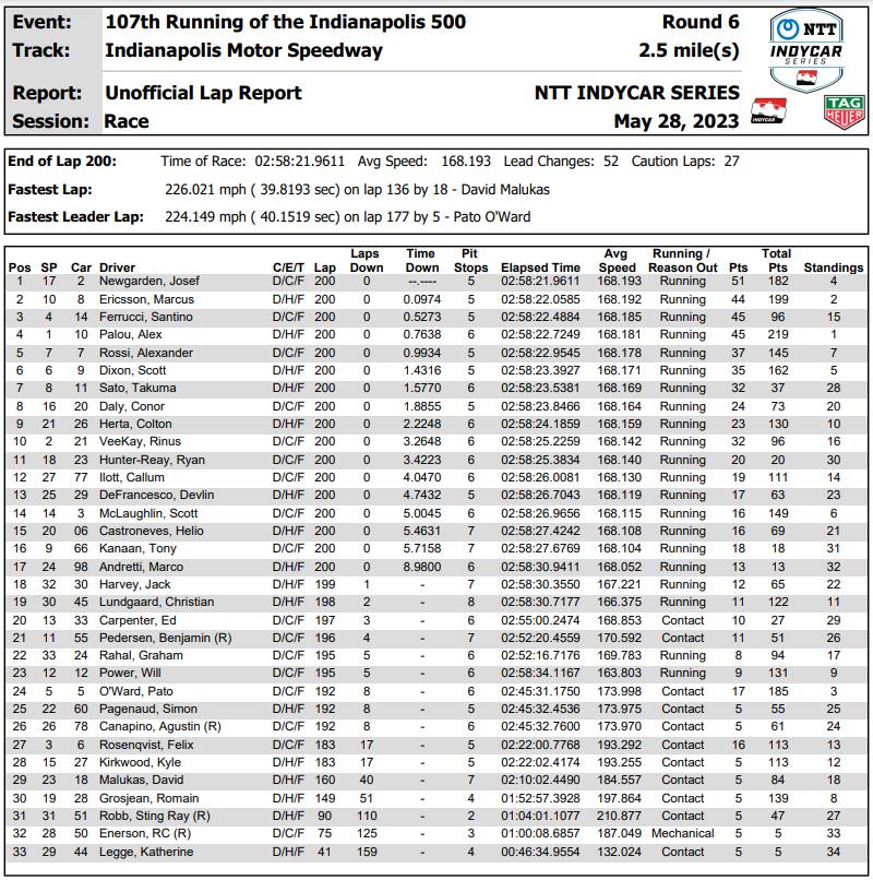 Josef Newgarden raggiunge finalmente il successo nella 500 Miglia di Indianapolis, entrando in Victory Lane dopo uno spettacolare confronto con Marcus Ericsson nell’ultimo giro, al quale si è arrivati dopo ben tre bandiere rosse sventolate nel corso degli ultimi quattrodici passaggi. Un trionfo memorabile per Newgarden, che ora aggiunge la 107esima Indy500 ai due titoli conquistati nel 2017 e 2019, entrando definitivamente nella storia del Motorsport. Penske, invece, tocca quota diciannove, il primo sigillo da proprietario di Indianapolis e della INDYCAR Series. Un momento speciale festeggiato tra la folla, raggiunta incredibilmente dal Newgarden dopo aver parcheggiato la propria Dallara-Chevrolet sulla Brickyard, aver oltrepassato il muro ed aver approfittato di un passaggio nelle recinzioni per abbracciare i tantissimi appassionati.