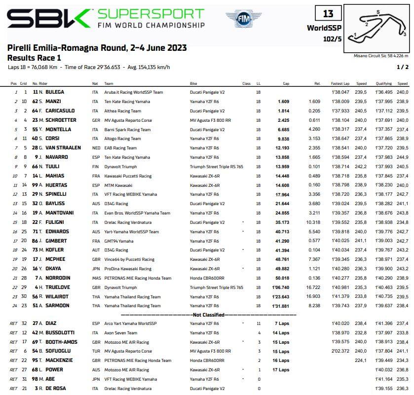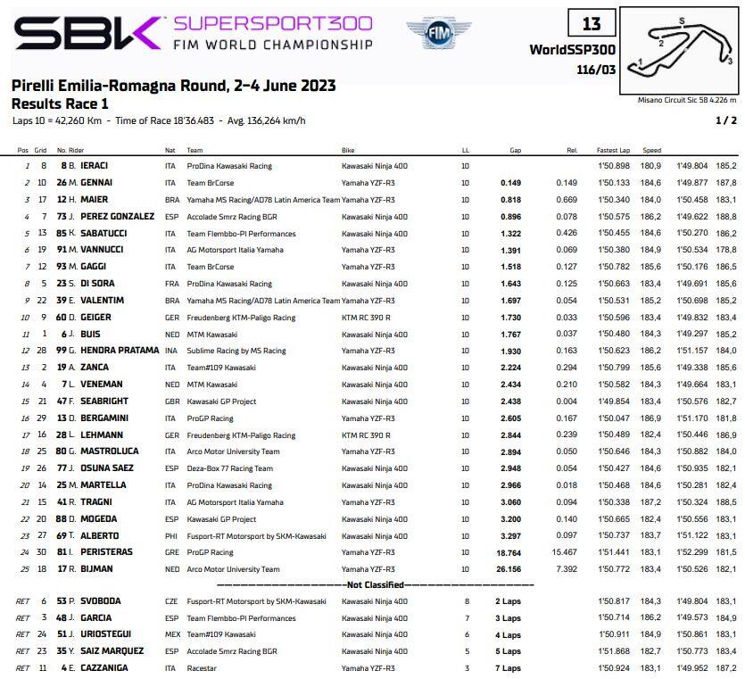 In Supersport 300 vittoria nel segno dell’emozione per Bruno Ieraci, leader nel CIV SS300 e wild card d’eccezione. Per il nativo di Giulinova è il primo successo in carriera al mondiale, ottenuto con un’ottima gestione della bagarre che gli ha permesso di precedere Mirko Gennai e Humberto Maier. Gennai, peraltro, balza in testa alla classifica di campionato complice la scivolata di Petr Svoboda. Bene anche Kevin Sabatucci, Matteo Vannucci e Marco Gaggi, al traguardo dal quinto al settimo posto.