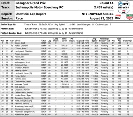 Alle spalle dei due veterani si è piazzato Patricio O’Ward, al sesto podio stagionale. Il messicano ha battuto Christian Lundgaard, rallentato da un secondo pit-stop molto lento per via di un problema al rifornimento. Negli ultimi giri il danese ha avuto a che fare con la Arrow McLaren di Alexander Rossi, 5° per soli cinque decimi di secondo. Buona rimonta, invece, per Will Power: il campione in carica ha rimontato dal 16° posto ottenuto in qualifica, superando a pochi giri dalla fine Alex Palou, 7°. Come anticipato in apertura, è stato proprio lo spagnolo a causare l’incidente multiplo nel primo giro, senza però subire un’investigazione da parte della direzione gara. Nello stesso episodio il suo primo rivale in campionato, Josef Newgarden, ci ha rimesso l’ala anteriore, perdendo due giri e al tempo stesso l’effettiva possibilità di lottare per il titolo nelle ultime tre gare stagionali, eventi straordinari a parte. Per quanto riguarda Palou, i 26 punti del 7° posto agevolano comunque il morale del leader della classifica, inseritosi nell’ennesimo capitolo della battaglia contrattuale che include McLaren e Ganassi. Alex, infatti, ha deciso di non rispettare gli accordi con la squadra inglese, che lo avrebbe schierato come titolare in Indy nel 2024 e come riserva in F1. Ciò ha creato delle perplessità anche nel management al seguito di Palou, che da oggi in poi non sarà più seguito da Monaco Increase.