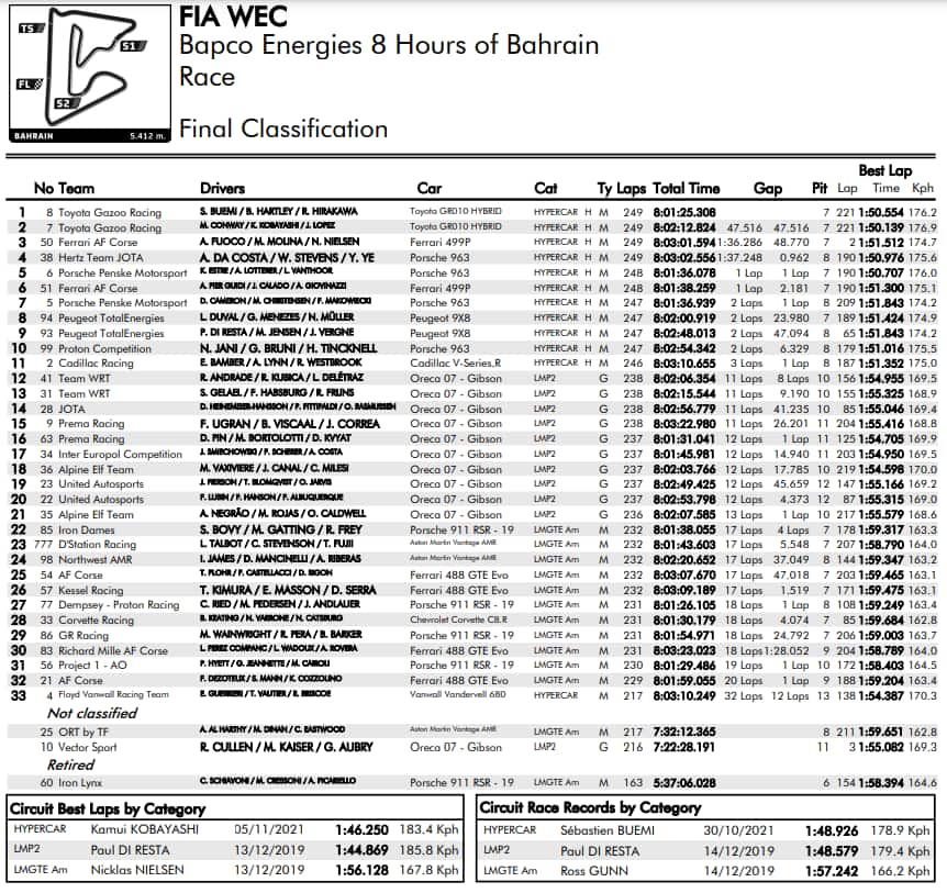 L'undicesima stagione del FIA WEC si chiude con la quarta doppietta di Toyota Gazoo Racing, prima sul traguardo con Brendon Hartley, Sebastien Buemi e Ryo Hirakawa. Vincendo la 8 Ore del Bahrain l'equipaggio numero 8 della casa giapponese conquista il secondo titolo piloti consecutivo, il quarto per Hartley e Buemi, il secondo per il giovane Hirakawa, facendo per altro seguito al Mondiale Costruttori vinto due mesi fa al Fuji. Toyota, dunque, porta a sei i titoli piloti e marche vinti nel FIA WEC, confermandosi anche e soprattutto nell'anno in cui la concorrenza è stata arricchita dalla presenza dei grandi marchi automobilistici, Ferrari in primis. Dominando la stagione, Toyota riesce a mitigare la beffa della sconfitta a Le Mans, confermandosi la Regina del Mondiale Endurance.