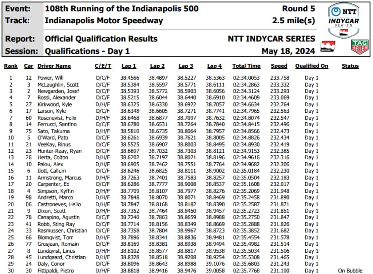 Il colpo di reni di VeeKay ha privato Colton Herta della Top12 Qualifying, con il californiano di Andretti che inizierà la Indy 500 dalla 13^ posizione. Le qualifiche di ieri, infatti, hanno definito la griglia dalla 13^ alla 30^ casella, spazio in cui troviamo anche tutti i piloti Chip Ganassi Racing. Il team in Pole nelle ultime due edizioni sta faticando a trovare la giusta finestra prestazionale ed ecco che Alex Palou, leader in campionato ed autore nel 2023 della Pole più veloce di sempre, si è dovuto accontentare del 14° posto, con Armstrong 16°, Simpson 18°, Dixon solo 21° e Lundqvist 27°. Anche Castroneves, a caccia della quinta vittoria, non ha avuto la possibilità di piazzarsi tra i primi 12, fermandosi al 20° posto. Menzione d'onore per il focoso Agustín Canapino, lanciatosi verso 4 giri velocissimi che l'avrebbero proiettato addirittura tra i primi 10. Tuttavia, all'inizio del terzo giro il motore Chevy ha perso potenza e l'argentino non ha potuto far altro che rientrare mestamente ai box con il 22° posto tra le mani.