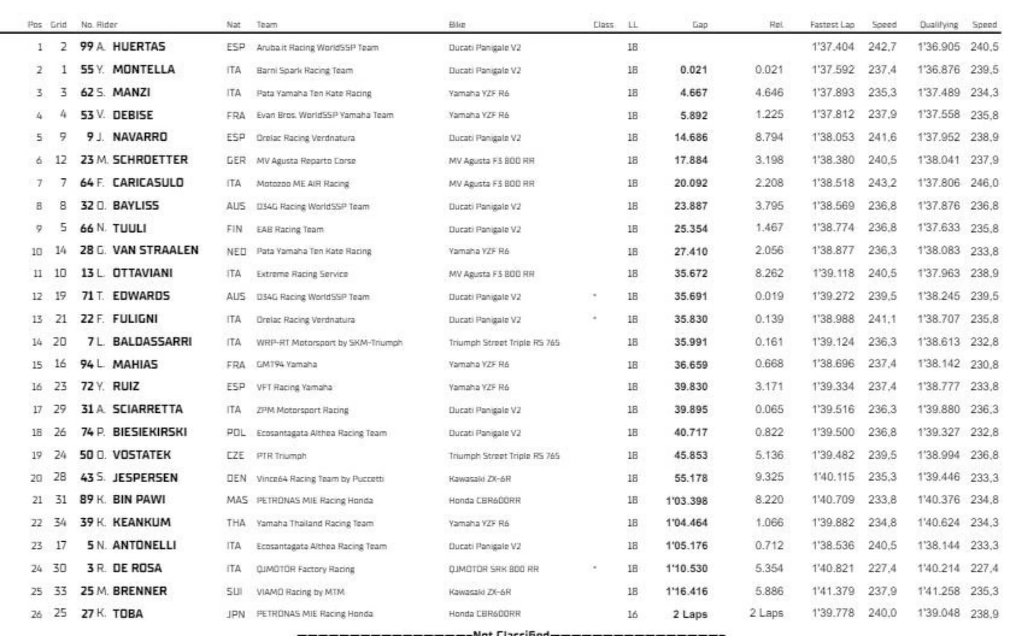 Passando alla Supersport, Gara 1 è stata interamente in mano alle Ducati di Yari Montella e Adrian Huertas. Il pilota del team Barni Spark ha dettato il passo conducendo dal primo metro all’uscita dell’ultima curva, dove un leggero slittamento del posteriore ha concesso a Huertas (che lo ha seguito a ruota per tutta la corsa) l’opportunità di affiancarlo e batterlo al fotofinish. Per lo spagnolo è il terzo successo stagionale, che peraltro gli vale la leadership in classifica con sei punti di margine su Montella. A podio anche Stefano Manzi dopo una lunga battaglia con Valentin Debise. Il passaggio alla Ducati di Orelac Racing sembra aver giovato a Jorge Navarro, quinto davanti a un Marcel Schroetter costretto a rimontare dopo una Superpole negativa che lo ha relegato in dodicesima posizione sulla griglia. Federico Caricasulo ottiene un buon settimo posto precedendo Oliver Bayliss, con Niki Tuuli e Glenn Van Straalen in chiusura di top-10. Punti iridati per Luca Ottaviani (11°), Federico Fuligni (13°) e Lorenzo Baldassarri (14°).
