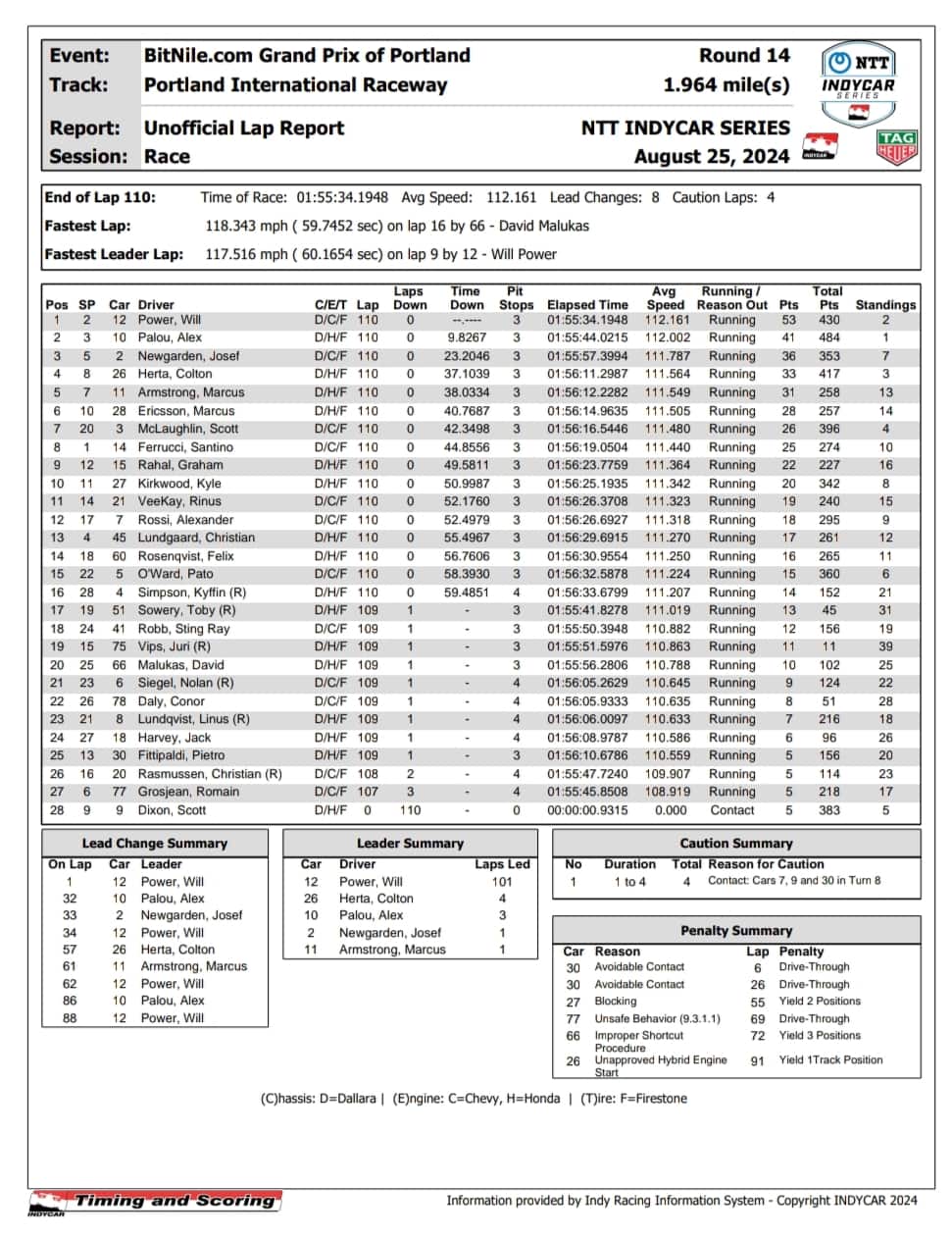 In Oregon è arrivata la terza vittoria stagionale di Will Power, dominatore incontrastato di un GP di Portland che consente all’australiano di restare in piena lotta per il titolo IndyCar 2024. Battendo in pista il capoclassifica Alex Palou, staccato di 10 secondi sul traguardo, Power ha recuperato 12 punti e la settimana prossima si presenterà a Milwaukee con 54 lunghezze di svantaggio a tre gare dalla fine. Se Power ha festeggiato la seconda vittoria in quel di Portland, dall’altra parte Palou non ha potuto far altro che commentare positivamente il 2° posto, un risultato che ha consolidato la leadership dello spagnolo nella fase decisiva del campionato. I tentativi del pilota Ganassi non sono mancati, ma Power ed il Team Penske hanno rasentato la perfezione nella sequenza dei pit-stop, avendo per di più la possibilità di montare le gomme morbide – le migliori anche in gara – per tre stint su quattro, mentre Palou ha dovuto scendere a compromessi non avendo a disposizione delle morbide in buono stato.