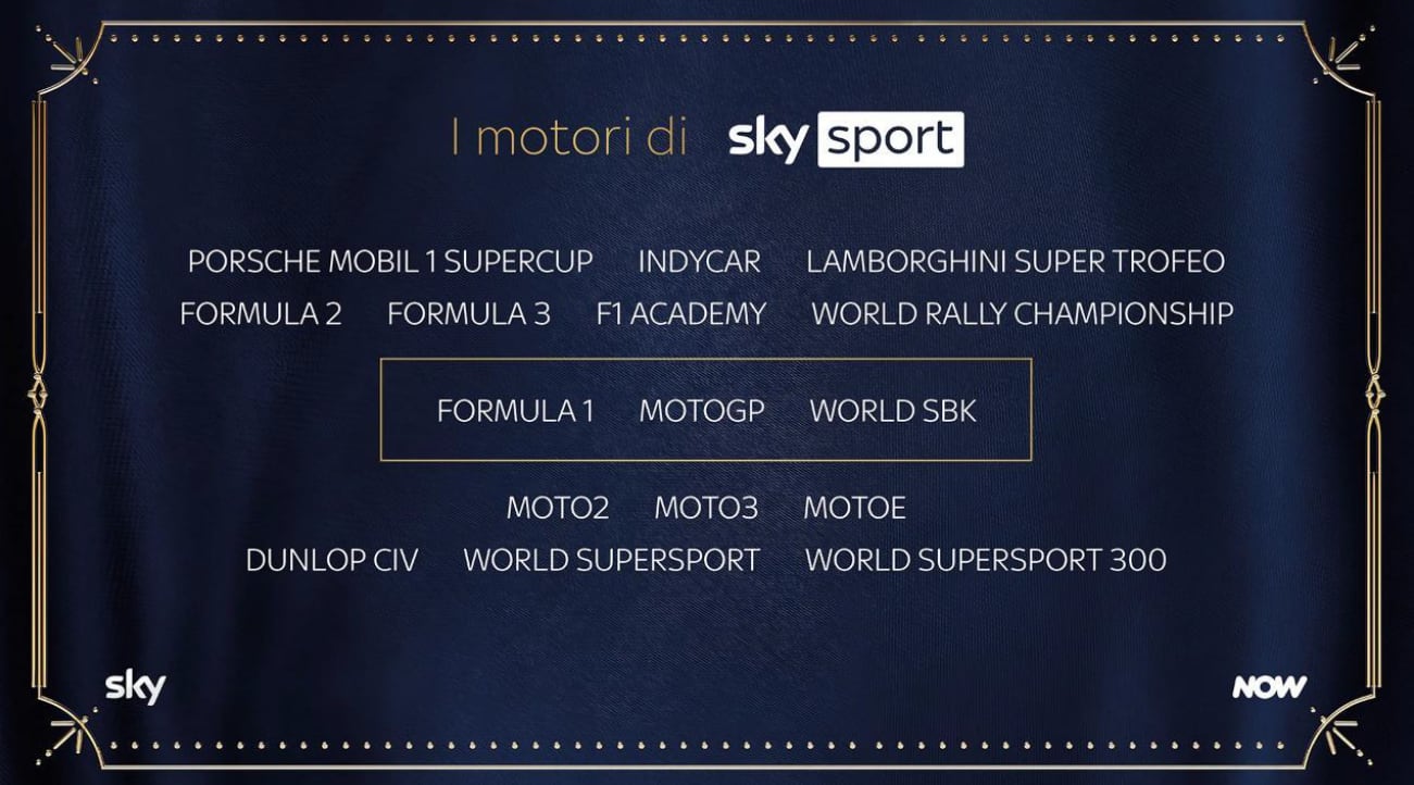 stagione 2025In griglia di partenza un avvincente 2025: 11 mesi di emozioni, dentro e fuori dalla pista, con più di 1000 ore LIVE su Sky e in streaming su NOW tra gare, analisi e rubriche. 42 weekend da non perdere, con oltre 200 sfide a due e quattro ruote. In pole position Formula 1 e MotoGP, con Formula 2, Formula 3, F1 Academy, Moto2 e Moto3, MotoE, Superbike, World Rally Championship, GTWC e lo show made in Usa della Indycar sui nostri canali fino al 2027