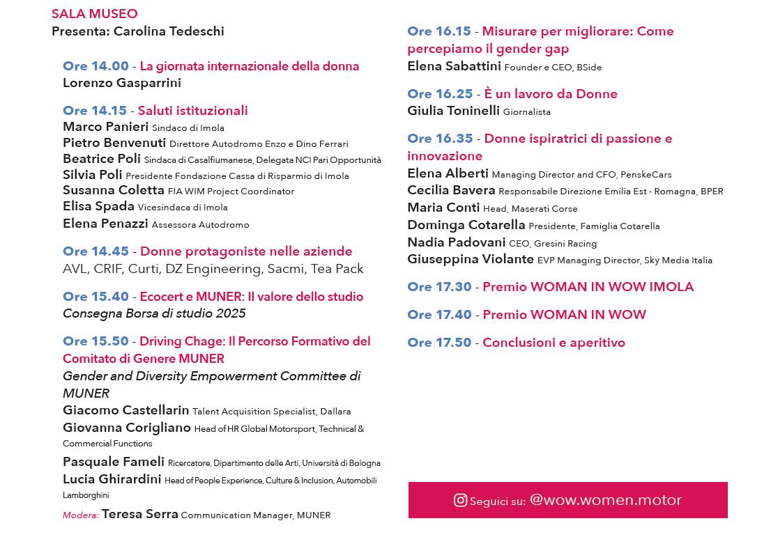 - FIA WIM: nel 2025 WOW vanta la presenza della Women In Motorsport Commission, ovvero la commissione della Federazione Internazionale che promuove la partecipazione delle donne in tutti gli ambiti del motorsport. FIA WIM sarà a Imola con la coordinatrice di progetto, Susanna Coletta. La Commissione porterà il suo contributo proponendo attività ai ragazzi sia delle scuole superiori che dell’università e prenderà parte anche al convegno del pomeriggio, raccontando cosa fa la commissione per diffondere il tema della parità di genere nel Motorsport.