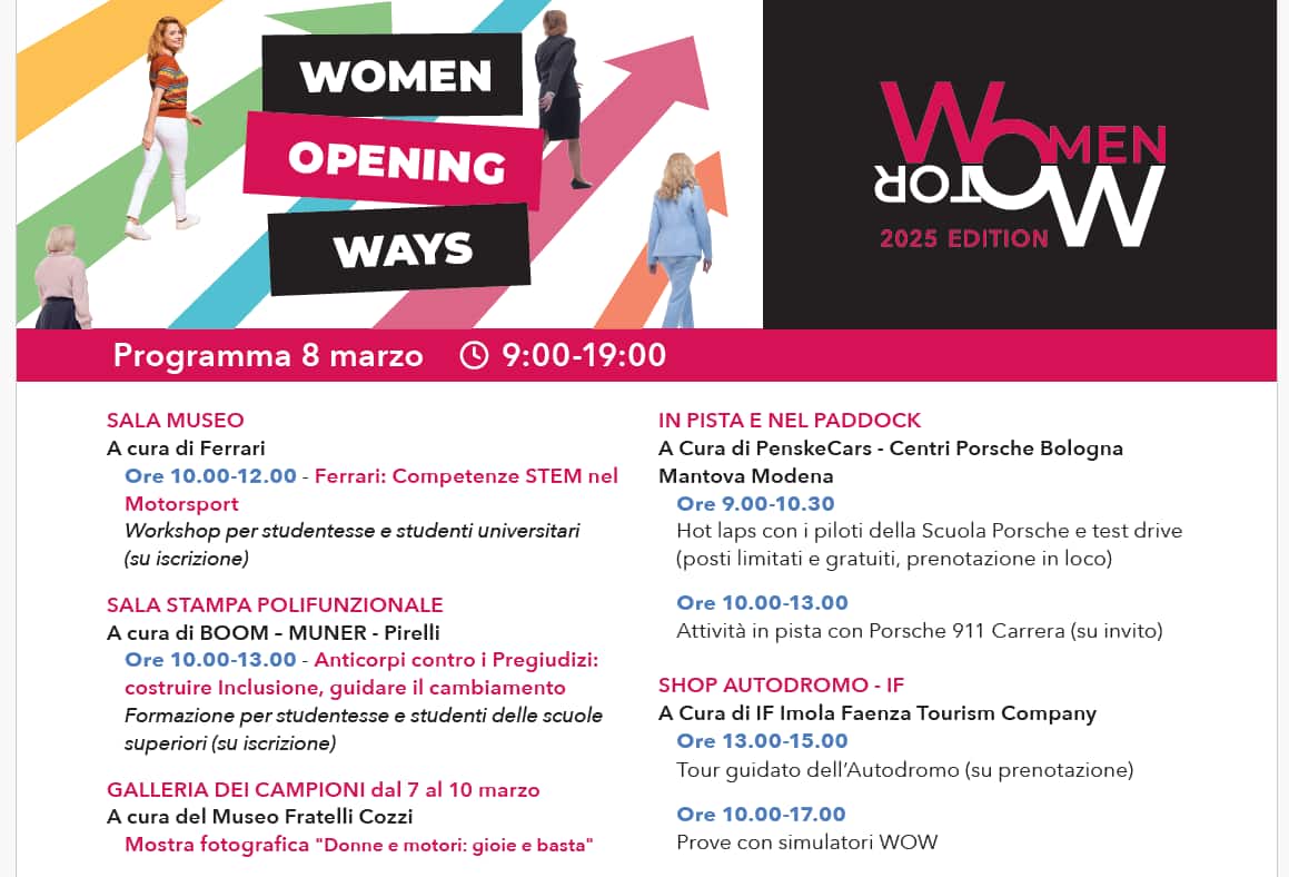 l'8 marzoSabato 8 marzo, l'Autodromo Internazionale "Enzo e Dino Ferrari" di Imola ospiterà la terza edizione di "WOW Women Motor". L'evento- promosso dal Comune di Imola e dall’Autodromo- offrirà contenuti e approfondimenti sul mondo dell’empowerment femminile e delle materie STEM