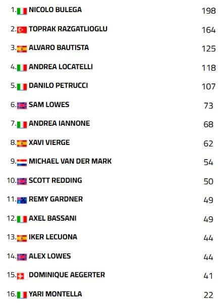 Di fronte a un Bulega inarrestabile, sul quale ormai c'è davvero poco da dire, il turco non può che accontentarsi della seconda posizione per assommare punti. Toprak è stato medaglia d'argento sia in Superpole Race che in Gara-2, così come Alvaro Bautista ha fatto sempre terzo in solitaria: le tre corse del weekend hanno avuto lo stesso identico podio, a testimonianza di valori in campo piuttosto chiari. A sorprendere, invece, sono state le Honda di Iker Lecuona e Xavi Vierge: il primo è scivolato in Superpole Race, ma in Gara-2 ha rimontato fino al sesto posto; il compagno di squadra ha chiuso quinto in mattinata, poi settimo.