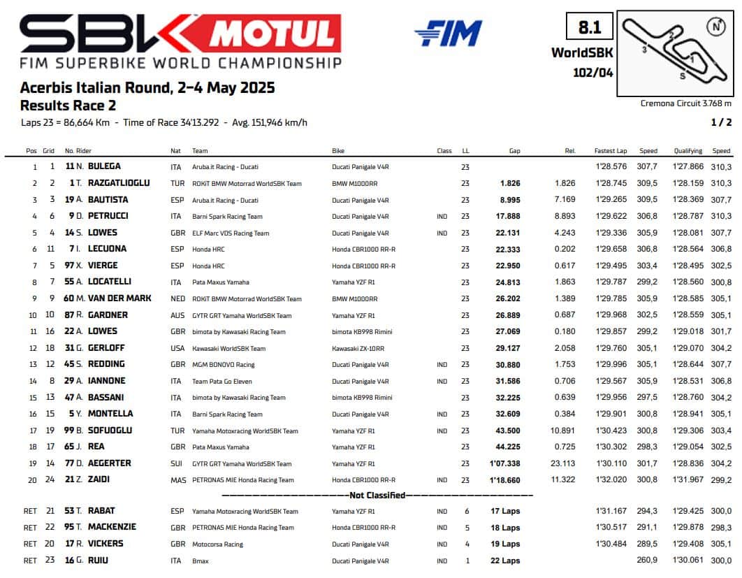 A CREMONABulega inarrestabile nella domenica di Cremona, in cui vince Superpole Race e Gara-2. Razgatlioglu e Bautista sempre secondo e terzo, Petrucci 4° nella gara lunga. Stupiscono le Honda