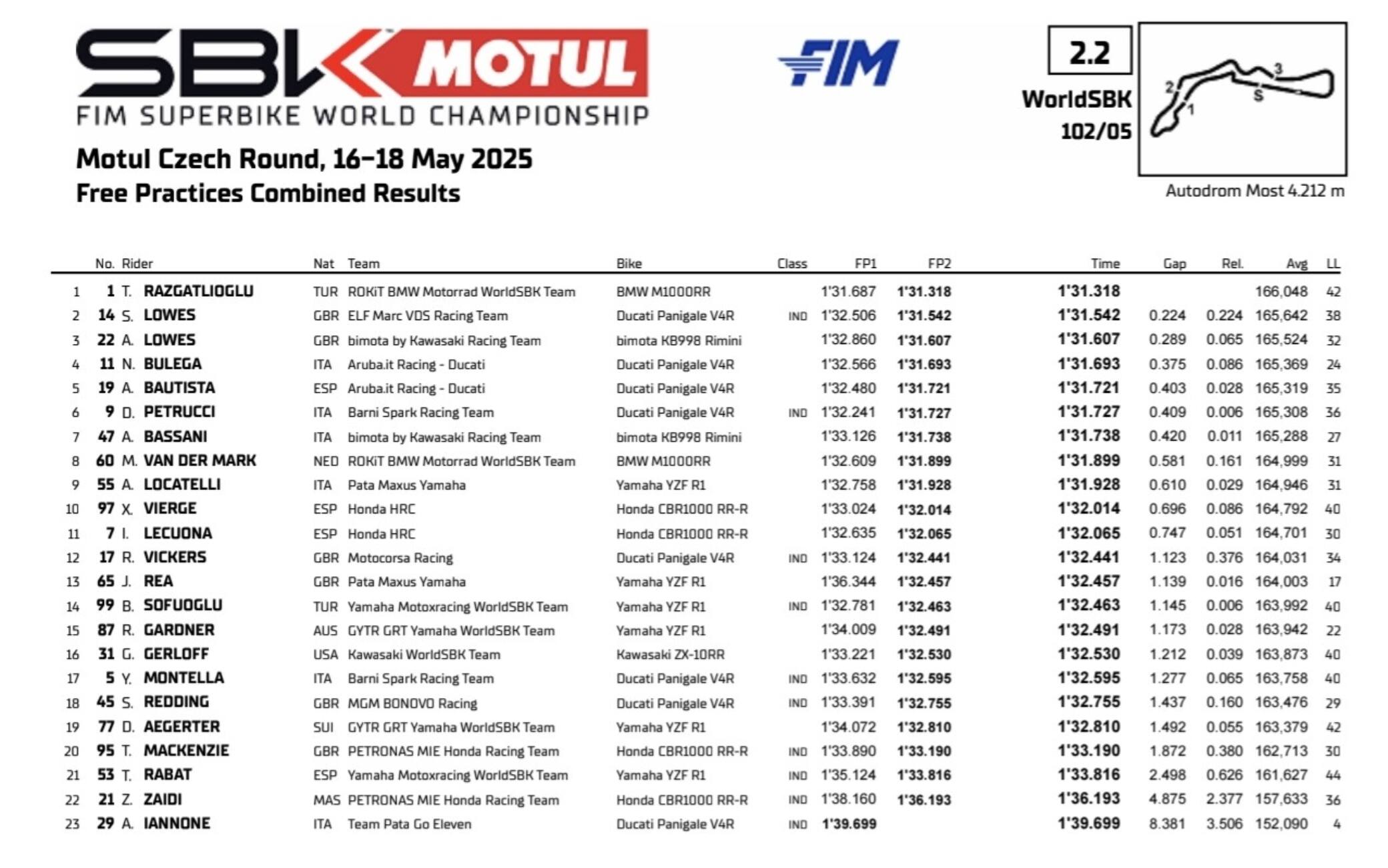 Tra tutte le piste del mondiale Superbike, Most è certamente una delle più gradite da Toprak Razgatlioglu, come dimostrano le otto vittorie conquistate in passato. Le prove libere del venerdì lo confermano anche nel 2025: il turco è stato il più rapido sia al mattino che al pomeriggio, comandando la classifica dei tempi della Superbike in 1'31"318. Se c'è un tracciato che può aiutarlo a recuperare terreno su Nicolò Bulega, è proprio quello della Repubblica Ceca.