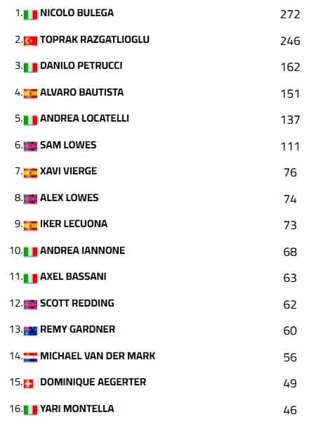Alle spalle dei due "intoccabili" ecco nuovamente Petrucci, al terzo podio consecutivo. Un podio arrivato tenendo dietro un coriaceo Alex Lowes, chiamato a cercare il primo podio del nuovo corso Bimota dopo la caduta di Bassani. Al quinto posto si è piazzato invece Andrea Locatelli, con Alvaro Bautista e Sam Lowes leggermente più staccati (arrivati al traguardo in ordine inverso, ma con una penalità per track limits assegnata all’inglese). Buon ottavo Yari Montella, a punti Michael Ruben Rinaldi (quindicesimo).