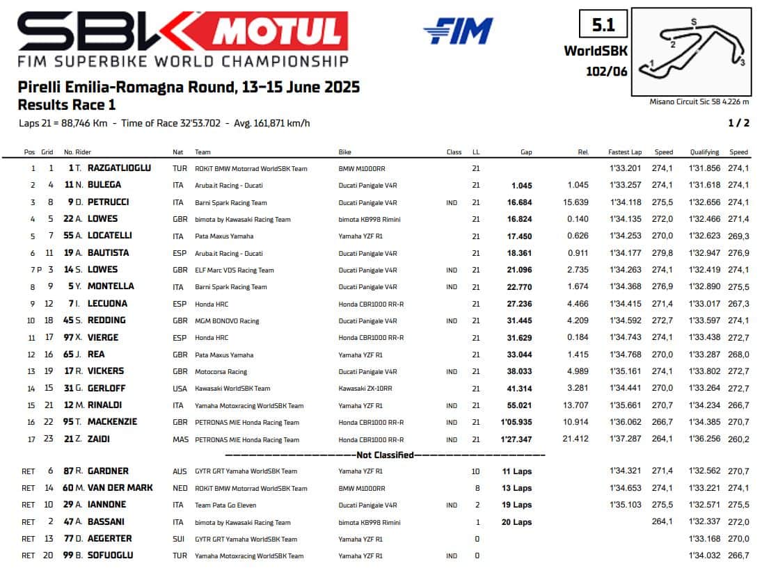 Sabato di gara per la Superbike al Misano World Circuit "Marco Simoncelli", in cui i mattatori del mondiale Nicolò Bulega e Toprak Razgatlioglu hanno nuovamente offerto spettacolo. Dopo una Superpole velocissima, valsa la pole all'italiano davanti al turco con tanto di giri in 1'31" per entrambi, Gara 1 ha visto il risultato finale ribaltarsi a favore del pilota BMW. Un epilogo forse sorprendente, dato il ruolo di favorito assegnato al ducatista a seguito dei test e delle prove.