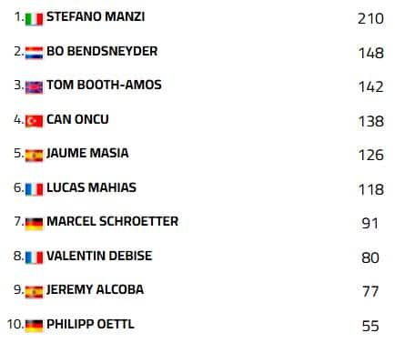 Il poleman Masià si è confermato in netta crescita, al terzo weekend consecutivo in zona podio e sempre più protagonista della categoria, mentre Oncu ha concluso una gara regolare e senza errori portando a casa punti importanti per la classifica generale. Giù dal podio Valentin Debise e Tom Booth-Amos, poi un plotone di quattro piloti molto ravvicinati in cui Marcel Schroetter ha preceduto Jeremy Alcoba, Lucas Mahias e Federico Caricasulo. Top-10 per Philipp Oettl, appena davanti a Mattia Casadei (autore di una cattiva partenza) e Leonardo Taccini.