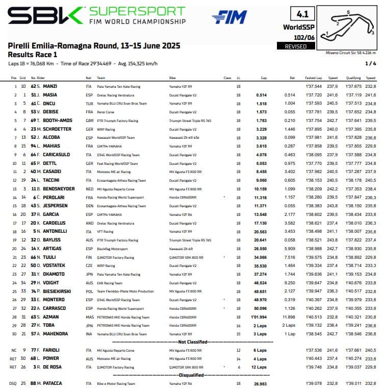 Per Stefano Manzi non poteva esserci soddisfazione più grande della vittoria in Gara 1 a Misano, pista di casa. Il leader di classifica del mondiale Supersport si è preso di forza il successo dopo la partenza dalla decima casella dello schieramento, guadagnando sei posizioni allo start e imponendosi come prima forza fin dai chilometri iniziali. L'italiano ha battagliato con Jaume Masià e Can Oncu, entrambi molto in forma, ma alla fine ha conquistato la sua seconda vittoria sul tracciato dedicato a Marco Simoncelli.