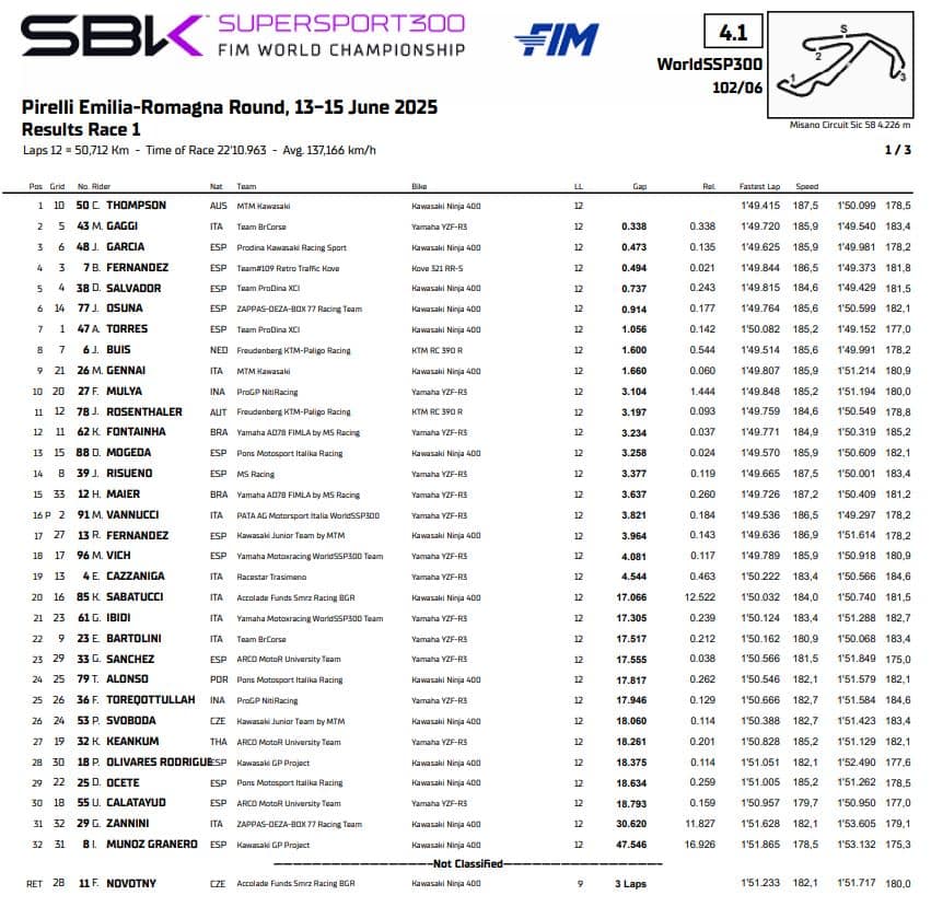 In Supersport 300 torna a ruggire Carter Thompson, che ha conquistato la prima vittoria nella categoria. Gran secondo posto nella vera e propria gara di casa per Marco Gaggi, al quarto podio in carriera. Julio Garcia ha battuto al photofinish Benat Fernandez per il terzo posto, guadagnando la testa della generale, mentre il quinto posto è andato a David Salvador. Nono Mirko Gennai, sedicesimo Matteo Vannucci, escluso dalla zona punti per una penalità dovuta ai track limits).