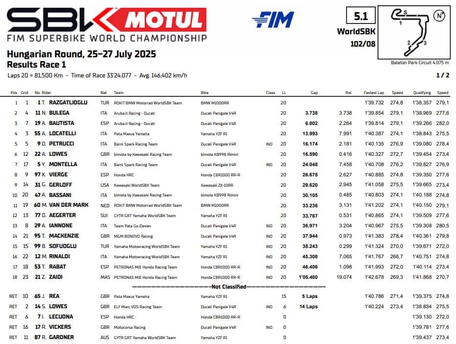 Toprak Razgatlioglu non ha intenzione di interrompere la sua striscia di vittorie consecutive e mette il sigillo anche sulla Gara 1 di Balaton Park. Il Campione del mondo Superbike in carica ha sbaragliato la concorrenza nel sabato ungherese, siglando la ventiduesima pole position in carriera e conquistando il settantesimo successo, il tredicesimo in questa stagione nonché il settimo di fila. Se nella prima partenza Andrea Locatelli era stato in grado di girargli davanti alla seconda curva, al restart dopo la bandiera rossa il turco ha tenuto la testa ed è andato in fuga, vincendo con tre secondi e sette di vantaggio su Nicolò Bulega.