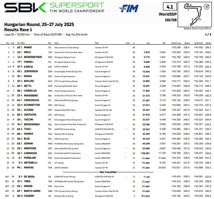 Stefano Manzi conquista anche Balaton Park, facendo sua la vittoria nella Gara 1 di Supersport. Il leader del mondiale ha raddrizzato un weekend partito non perfettamente, dovuto a un venerdì non brillantissimo soprattutto nelle prove libere. Scattato dalla quinta casella dello schieramento, l'italiano del team Ten Kate ha rimontato su Can Oncu e, dopo averlo passato, ha costruito un margine di vantaggio sufficiente per gestire la seconda metà gara.