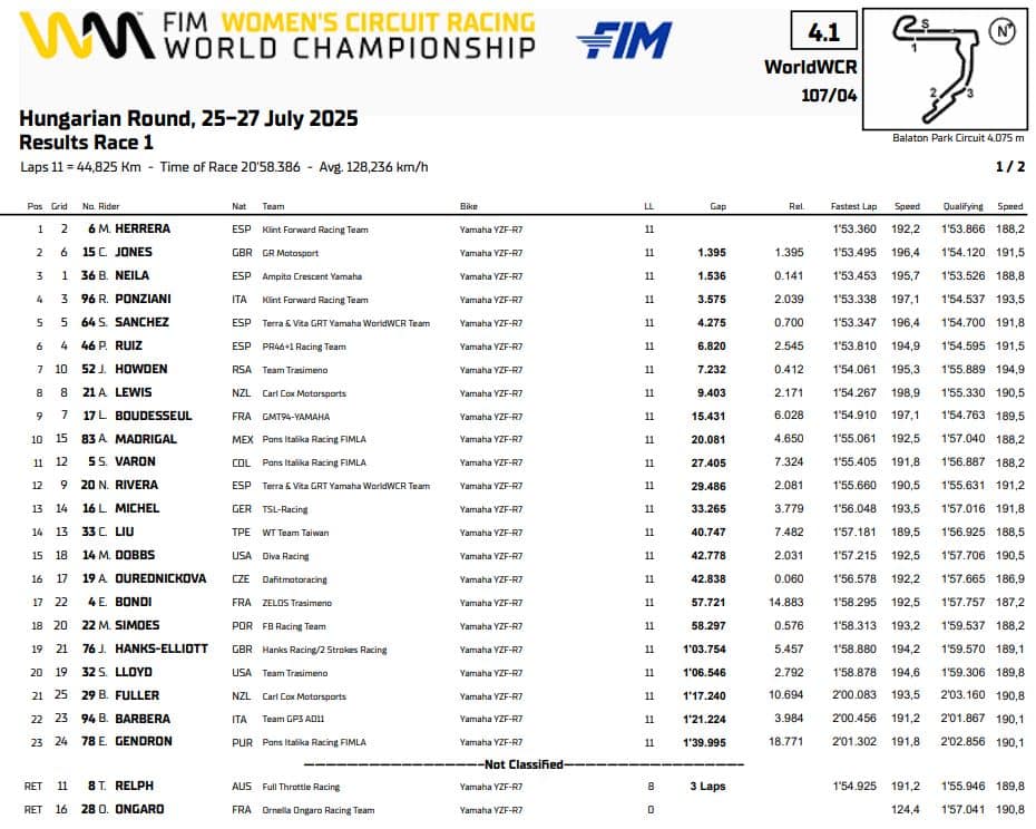 Nel WorldWCR Maria Herrera vince una Gara 1 frizzante, in cui una lieve pioggia ha reso incerti i primi chilometri. La spagnola ha preceduto Chloe Jones, che ha sfruttato un errore di Beatriz Neila per passarla all'ultima chicane e conquistare il suo miglior risultato personale. Neila ha chiuso il podio, mentre Roberta Ponziani ha avuto la meglio di Sara Sanchez per la quarta piazza. Ventiduesima Beatrice Barbera.